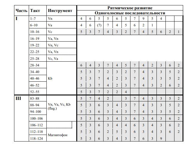 Разделы, в которых представлены одноголосные тембровые линии, располагают полными 12-элементными рядами длительностей. Они стабильны. Этот ряд упорядочен следующим образом: 5 — 3 — 7 — 4 — 3 — 2 — 7 — 4 — 5 — 6 — 2 — 1. Впервые полный ритмический ряд появляется в т. 10–16 в партии виолончели. Паузы, возникающие в ходе развития ряда, оказываются неотъемлемой частью общей ритмической структуры и будут прибавлены к длительности предшествующих звуков (как у Веберна).