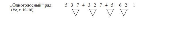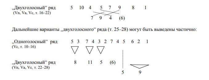 Для удобства ориентации в ритмических процессах ДА представляется целесообразным выделение одноголосных и двухголосных разделов в отдельные столбики. Такой способ обусловлен единством и константностью рядов рамках соответствующих разделов. Следует указать на исходное и глубинное родство между двумя ритмическими рядами, привлекая с этой целью числовые расчеты. При селективном сложении двух смежных чисел из "одноголосного" ряда (5 3 7 4 3 2 7 4 5 6 2 1, т. 10–16) образуется начальный "двухголосный" ряд (5 10 4 6 7 9 8 1, т. 16–22). Происхождение чисел из второго голоса можно объяснить несколько гипотетически: