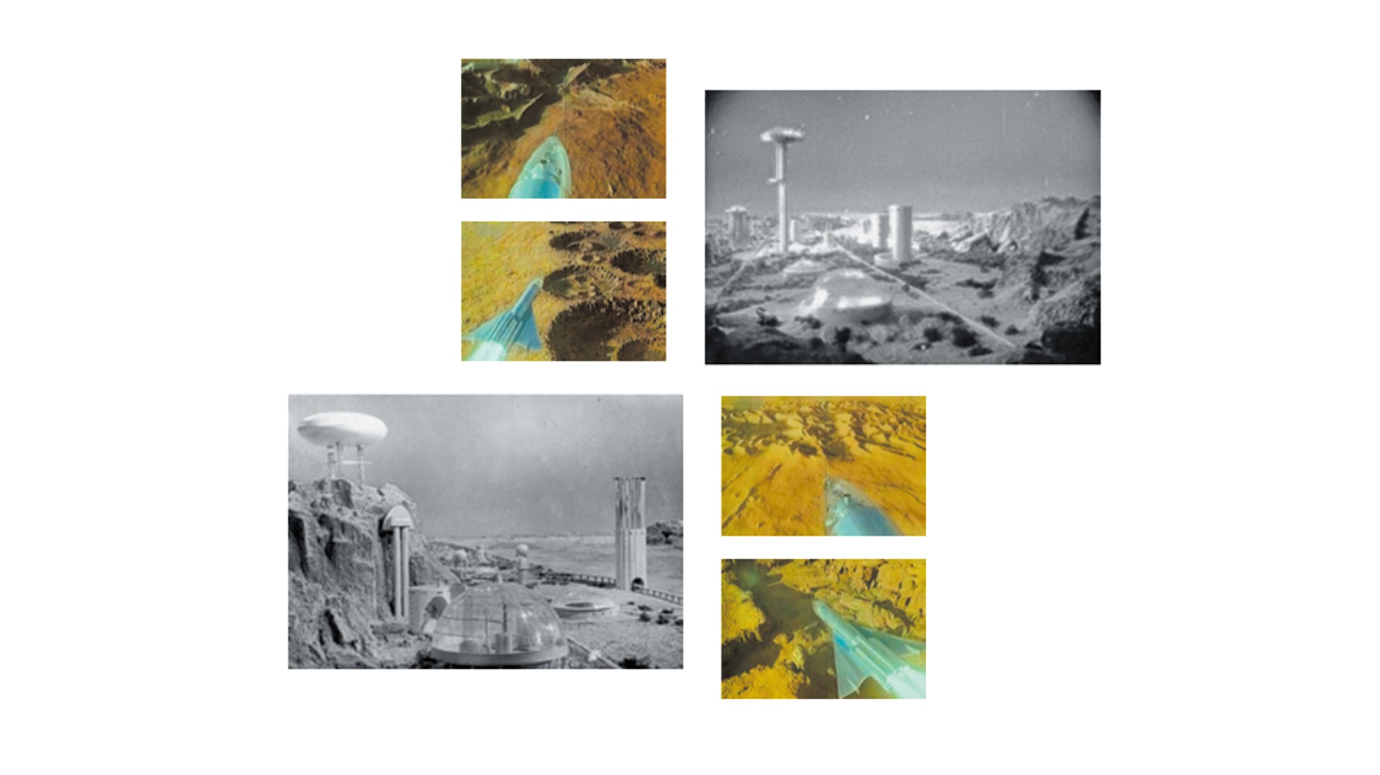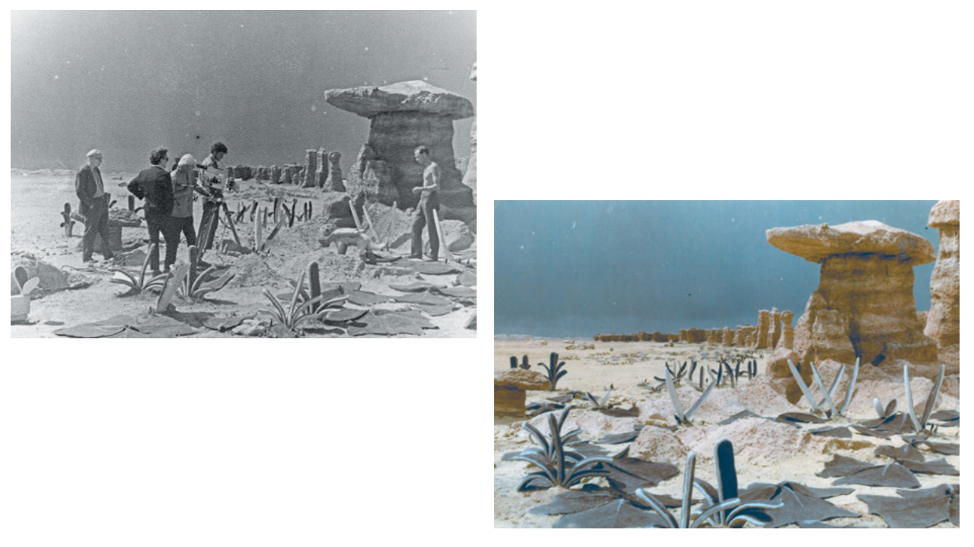 Снимался макет поверхности Марса с обилием мелких кратеров. Чтобы рельеф местности был лучше виден, нужно было снимать его на восходе Солнца. Но на Чайной горке в Ялте, где мы работали, это было невозможно. Пришлось поставить макет в наклонное положение и для нашего Марса восход Солнца начался только перед обеденным перерывом. Снимали макет как бы с летящего самолета. Для этого камеру с оператором поместили на площадку, которая находилась выше макета и была шире его. Катилась она на колесах по рельсам, проложенным по обе стороны от макета. И здесь стоял огромный, как на «Луне», изогнутый сорокаметровый задник. Только не черный, а синий, так как на Марсе все-таки есть атмосфера, хоть и разреженная, и небо там имеет синий цвет. Таких обзоров разных форм марсианской поверхности было несколько. Все они сняты, вошли в картину, но совершенно неожиданно принесли мне сложности при сдаче. Цензор, увидев эти кадры, потребовал от меня предъявить разрешение на съемку с самолета. Я говорю ему, что это Марс. Принесите справку! Я говорю, что это макет размером всего пятнадцать квадратных метров. Принесите справку! Бывали и сложные съемки. Например, надо было показать, как зарождается смерч. Происходит завихрение, поднимая с грунта пыль и песок, растет извивающийся черный столб, движется по пустыне. Как это снять? Идея принадлежит художнику Ивану Ивановичу Егорову. Он предложил сделать большой аквариум, на дно положить мелкий песок, закрутить сверху воду, песок станет подниматься со дна, закручиваться столбиком. Так и сделали. Получился настоящий смерч! Сняли.