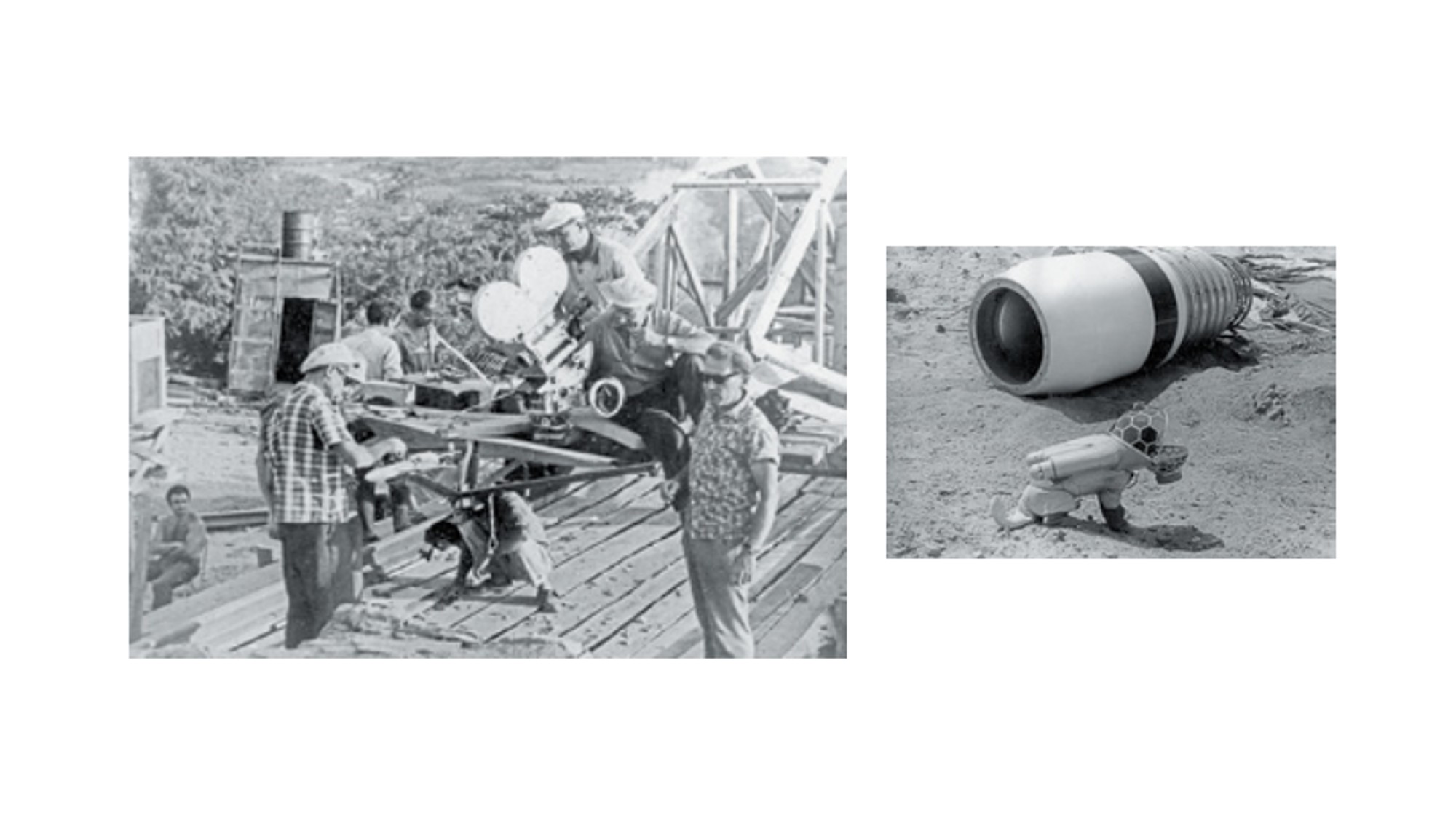 На картине работал и второй художник — Вячеслав Александров. По его эскизам была сделана «марсианская растительность», совершенно необычная по форме и удивительно красивая. (Юрий Швец, работавший со мной на «Луне», трагически погиб в автокатастрофе вскоре после завершения работы над картиной). Была и такая съемка: по орбите вокруг Марса летит космический корабль. Марс при этом виден как часть огромного шара на фоне черного звездного неба. Мы как бы летим за кораблем, чуть повыше его. Корабль огибает огромный шар, и из-за горизонта поднимаются все новые и новые созвездия. Очень сложная декорация! Часть шара диаметром четыре метра. Вокруг него задник — черное небо со звездами-лампочками, изогнутое в полуокружность. Под шаром, на общей с ним оси, — карусель, выходящая за пределы шара. На ней площадка со съемочным аппаратом, положенным на бок, и макет космического корабля перед ним. Они вместе и «летят» вокруг Марса. Никаких фокусов в этой съемке, собственно, нет. И прошла она гладко. Интересна сама декорация.
