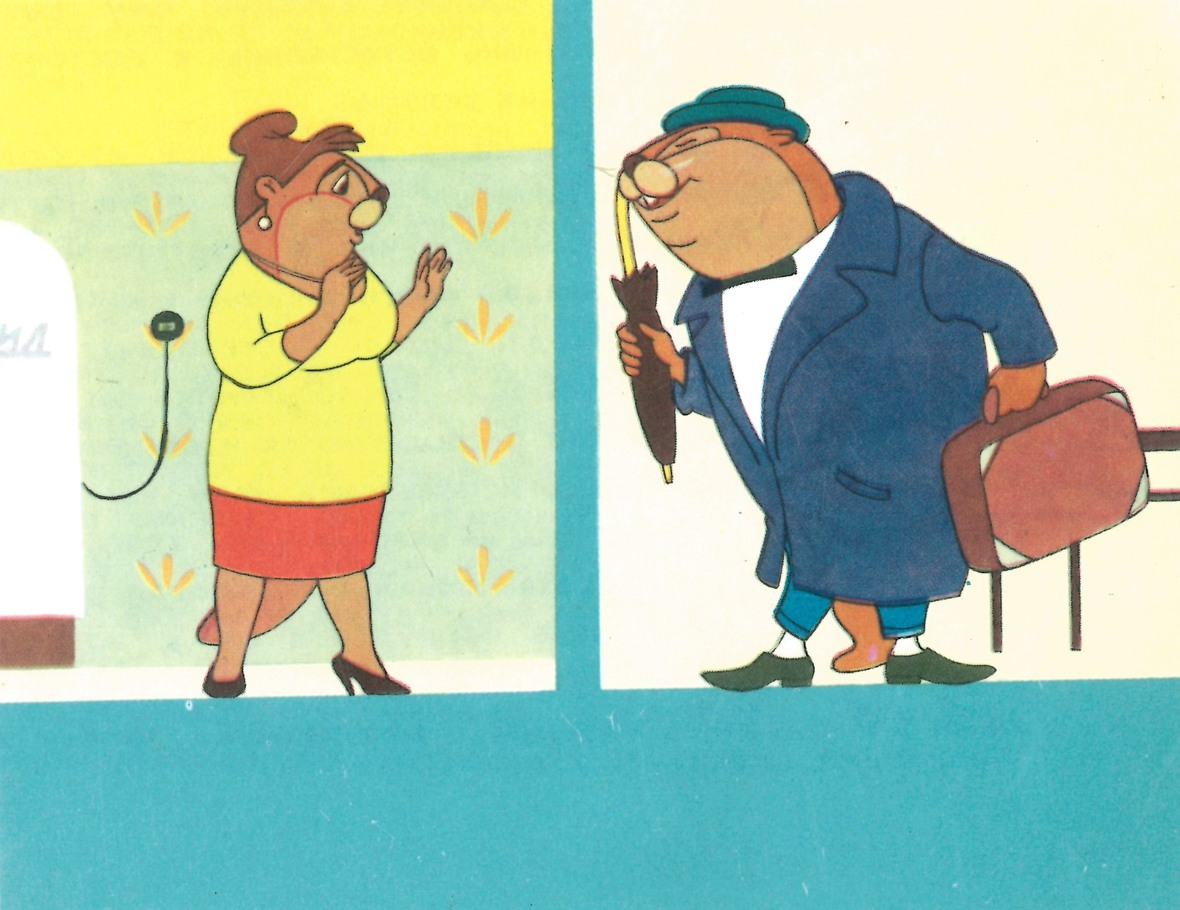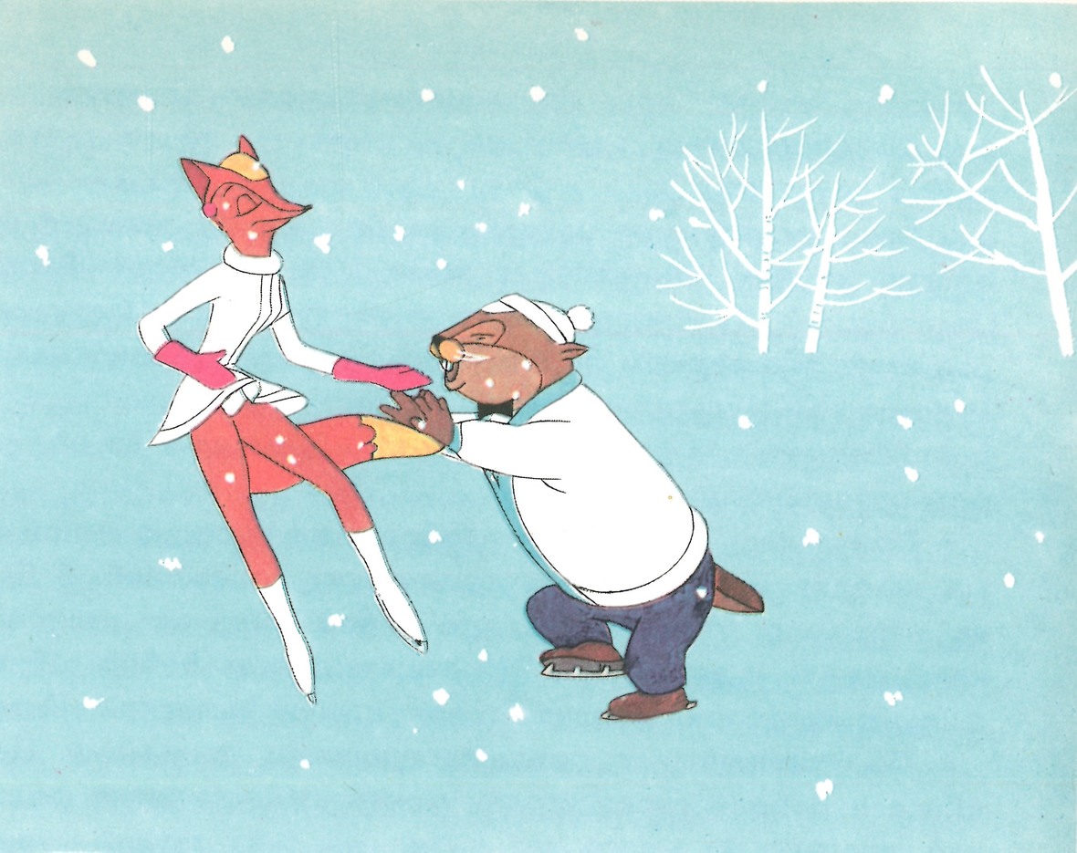 Вот Лиса приемами опытной соблазнительницы завоевывает сердце Бобра. Кокетливо задирает край юбочки, показывает ножку, «вертит хвостом» не только в переносном, но и в прямом смысле. А пожилой, почтенный на вид Бобер, в добротном пальто, в каракулевой шапке, в калошах, совсем растаял. Обнажая свои бобровые резцы, поет Лисе чувствительный романс и, как на гитаре, подыгрывает себе на солидном учрежденческом портфеле.