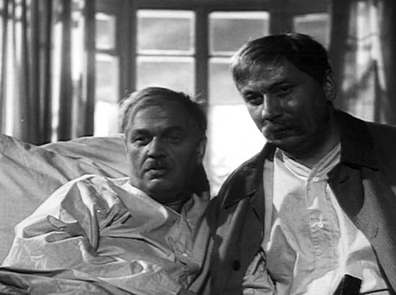 Он делится с людьми своей шуткой потому, что у него шуток в голове сколько хочешь, а людям их не хватает. Он делится потому, что щедр, потому, что сам хорошо знает, как трудно и тоскливо жить на свете, не слыша веселого, бескорыстного, согревающего душу человеческого слова. Бывает, что человек вечно шутит потому, что живет поверхностно, не задумывается о происходящем вокруг. А этот — наоборот. Степан Иванович слишком хорошо знает, чего стоит жизнь. И именно поэтому так дорого стоит его шутка, шутка беззаветного друга и помощника людей, шутка человека, умеющего быть предельно сосредоточенным, взволнованным, всерьез озабоченным. Застенчивой нежностью, по-детски искренней торжественностью охвачен он в минуту прощания с госпиталем, с товарищами по палате. «Поправляйся, Семен Петрович», — обращается он к смертельно больному Воробьеву. В том, что он произносит эти слова, стоя на коленях перед постелью комиссара, нет ничего картинного, подчеркнутого, нарочитого. В выздоровление комиссара Степан Иванович в глубине души не верит. Это придает его лицу страдальчески-напряженное выражение. И все-таки он естествен даже в эту тяжкую для него минуту. Точно так же естествен он, когда кланяется в пояс медицинской сестре или шагает за гробом комиссара, держа на вытянутых руках подушки с орденами.