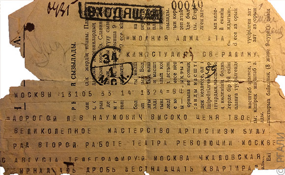 ДОРОГОЙ ЛЕВ НАУМОВИЧ ЦЕНЯ ТВОЕ ВЕЛИКОЛЕПНОЕ МАСТЕРСТВО АРТИСТИЗМ БУДУ РАД ВТОРОЙ РАБОТЕ ТЕАТРА РЕВОЛЮЦИИ МОСКВЕ РЕВОЛЮЦИИ МОСКВЕ С АВГУСТА ТЕЛЕГРАФИРУЙ МОСКВА ЧКАЛОВСКАЯ < ЧЕТЫРНАДЦАТЬ> ДРОБЬ ШЕСТНАДЦАТЬ КВАРТИРА ШЕСТЬДЕСЯТ Т, 2 + ОХЛОПКОВ