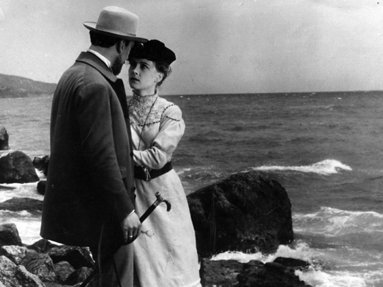 На экране огромное, точно выгоревшее небо с легкими тенями облаков, серый гранит набережной, раскаленный осенним, но еще жарким солнцем, поблескивающее море и маленькая фигура женщины в черном берете. Громадная, светло-серая чаша неба как бы повторяется в чуть более темном по тону лениво спящем море. Медленно и бесцельно бредет по набережной Анна Сергеевна, ее серое платье только слегка светлее неба. Поэтому фигура вписывается в пейзаж, ничем не нарушая его спокойного, ленивого ритма. «Кажущееся однообразие тонов, — замечает М. Меркель, — это замысел операторов, решивших увидеть окружающее так, как видят его скучающие, полусонные, разморенные зноем обитатели модного курорта». Это только отчасти справедливо. Куда более важно другое — кажущаяся монотонность, однообразие тонов точно воспроизводит будничную, намеренно спокойную интонацию чеховского рассказа, его ритмику. Молочный свет осеннего солнца мягко окутывает дали, парапет набережной и фигуру Анны Сергеевны. Серо-жемчужный колорит кадров, молочная пелена воздуха, как бы застывшего в неподвижности, — все создает ощущение ленивого покоя, тягучего обыденного течения жизни. ‹…›