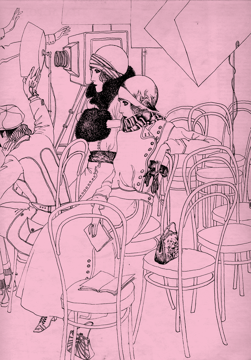 Когда сидели под круглым навесом и пили вино, пришли солдаты, встали вокруг и смотрели на нее.