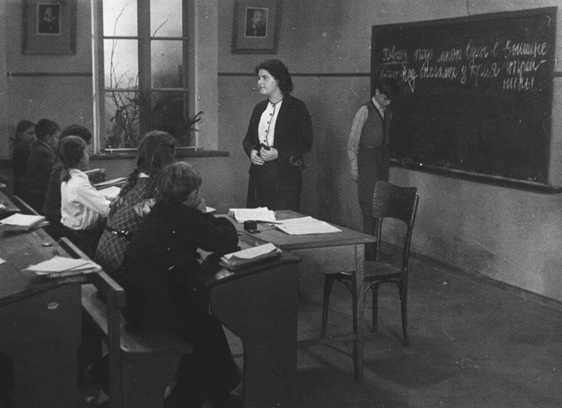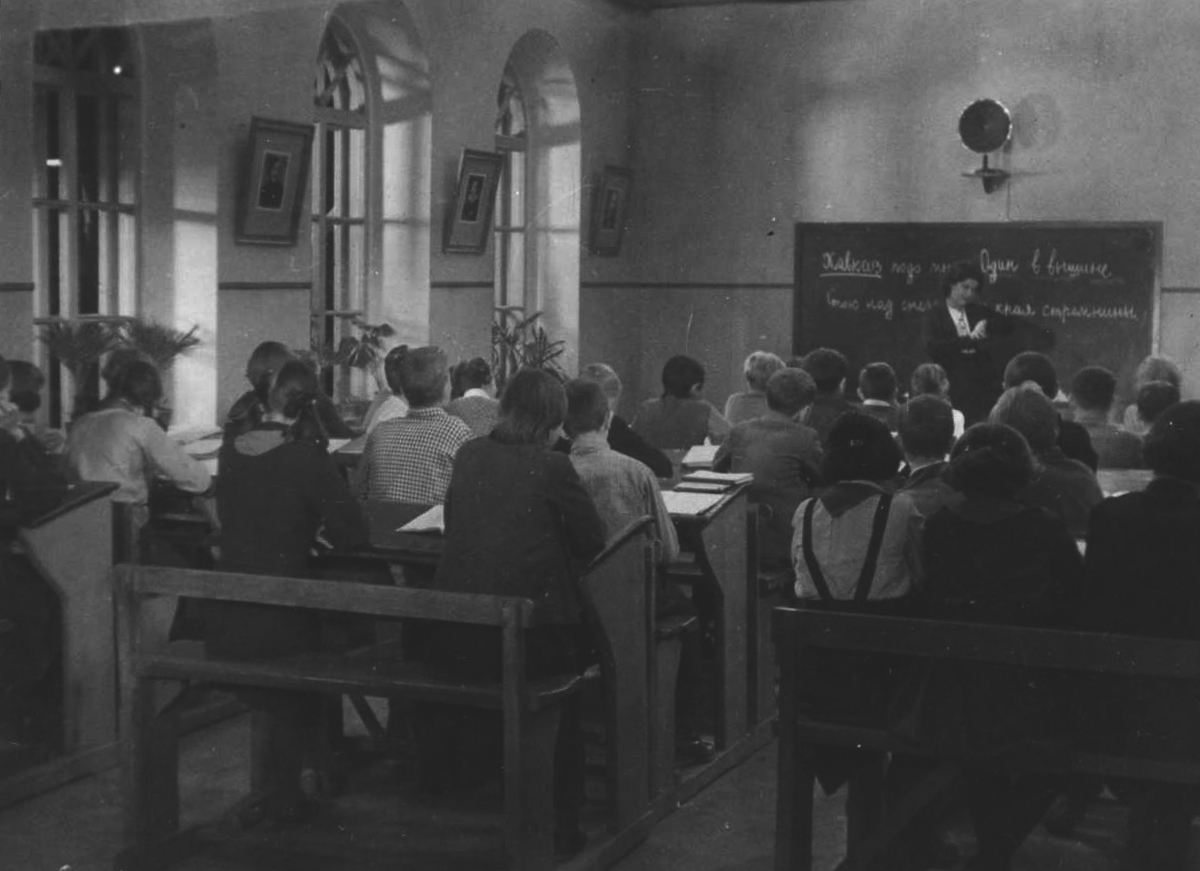 Красивая девочка Зина осмеливается завивать свои густые подрезанные волосы, накручивая их пряди на раскаленный строительный гвоздь. Над ней смеются, презрительно обзывают графиней, и эти воспитательные меры приносят плоды — мы узнаем, что она исправилась: «Физику стала учить и даже бросила завиваться», — удовлетворенно докладывает боевитая и чрезвычайно необаятельная активистка Валя, угреватая, с выпуклым лбом, прямым пробором и тяжелым подбородком.