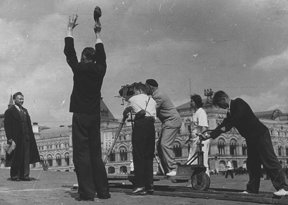 Но и новая, социалистическая Москва выглядит тут не обильной и радостной столицей мира, а тем унылым казенным городом, где не сыскать ни одной эстетичной вещи, ни одного элегантно одетого человека. На экране сплошь — заборы, задворки, строительный мусор и безликие фасады. В скучных интерьерах — мебель самого казенного образца, технические схемы, географические карты и наглядная агитация в виде стандартных портретов вождей — куда же без них! В магазине, снятом одним долгим планом, продавцов нет, и кажется, что по прилавкам и полкам разложены — опять же, не для продажи, а для агитации — не продукты, а их муляжи. Да так оно, верно, и есть. Одну уличную витрину — за неимением, видимо, товаров — украшает огромная бутафорская... ромашка, в другой — на большом расстоянии друг от друга совсем уж сиротливо стоят ровно пять узких бутылок — с подсолнечным маслом, что ли? А над ними — пустота...
