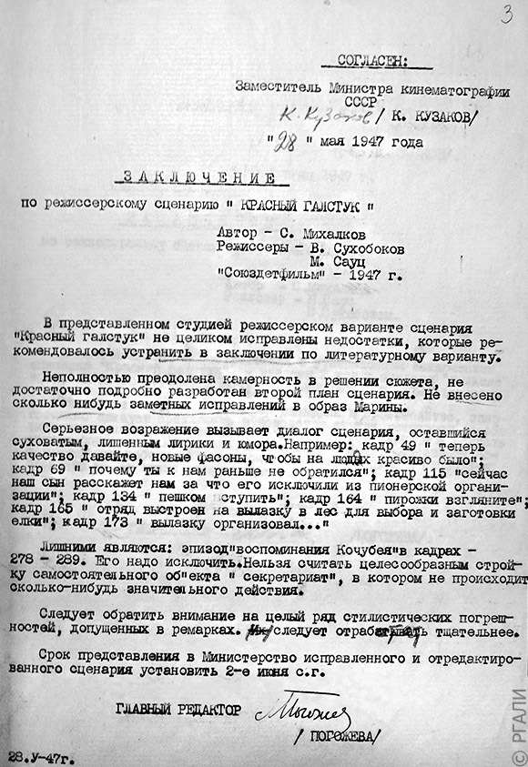 Министерство кинематографии СССР. Сценарно-постановочный отдел. «Красный галстук». Заключение по литературному и режиссерскому сценариям и анализ работы по производству кинокартины // РГАЛИ. Ф. 2456. Оп. 1 ед. хр. 1690. Л. 3.