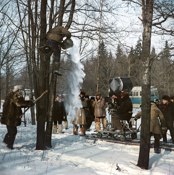 Сибирские эпизоды начинаются сверхобщим планом огромной горной выработки. По склонам открытого разреза движутся маленькие, будто игрушечные, грузовики с породой — пространство широко распахивается здесь перед героем. Разрез снят в золотистых, теплых тонах — своей приветливой теплотой пространство манит героя, влечет к себе. Оно умышленно снято распахнутым и притягательным — Катя и Саша, московские жители, часто фиксируются на фоне массивных серых стен, в подъездах, в узких коридорах, то есть в пространстве сжатом, ограниченном.