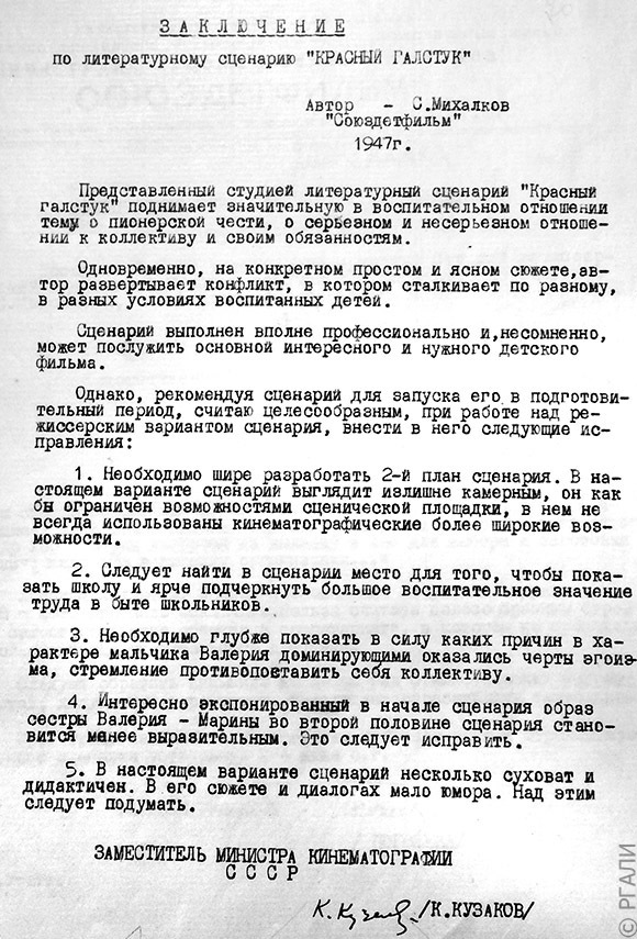 Министерство кинематографии СССР. Сценарно-постановочный отдел. «Красный галстук». Заключение по литературному и режиссерскому сценариям и анализ работы по производству кинокартины // РГАЛИ. Ф. 2456. Оп. 1 ед. хр. 1690. Л. 1.