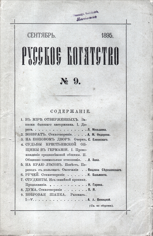 Но и последующие публикации в «Русском богатстве» и «Мире Божьем» (эти журналы на тот момент входили в первую пятерку по популярности и общественному авторитету) оказались включены не столько в литературный, сколько в идеологический контекст. Оба издания были вполне дружественными и прогрессивными. Серошевский вписался сразу в несколько контекстов. Достаточно просмотреть оглавление, чтобы отметить целый ряд с той или иной точки зрения близких публикаций: повести Стефана Жеромского и очерки Леона Василевского (переводы с польского), записки и стихи отбывшего каторгу и жившего на поселении в Кургане П. Ф. Якубовича, сибирские рассказы и повести Д. Н. Мамина-Сибиряка и еще целый ряд материалов по истории и современности Урала и Сибири, а также «Челкаш» Максима Горького. Произведения (как это и должно быть в хорошем журнале) стягивались ниточками взаимосвязей: поляки, каторга и ссылка, восточные окраины, русифицируемые инородцы (припомним особый интерес к этой теме со времен «Мултанского дела»), босяки-маргиналы... Заглавия и подзаголовки заранее устанавливали главный — «идейный»! — смысл публикаций: «Кусок хлеба», «Бездомные», «Впотьмах», «В голодный год», «Без дороги», «Захолустье», «Заброшенные дети», «В мире отверженных: Записки бывшего каторжника» и так далее. Именно в эти контексты вписались якутские рассказы и повести: «На краю лесов», «Предел скорби: Повесть из жизни прокаженных».