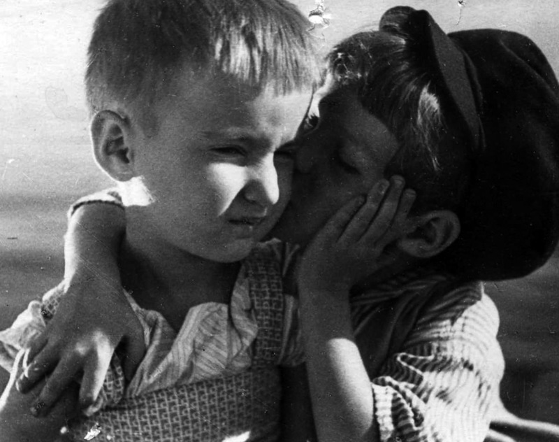 Совершенно новая трудность встала перед нами, как заставить трехлетних вести диалог, осваивая текст в куске, где Эмма рассказывает Буби о том, что отца арестовали, что мамочка плачет и т. д. Было девять реплик, которые распределялись между двумя трехлетками. Осваивание текста происходило следующим образом: дети приходили ко мне заблаговременно, до съемки несколько раз. Первый раз я рассказывала им историю, в которую входили все элементы этого текста. Эта история была про бедную девочку — история эта очень понравилась. Всем известно, что дети любят повторение понравившейся истории. Какое-то время я повторяла эту историю детям. Они сами начали ее рассказывать, и тут возникло сразу две трудности. Первая — дети рассказывали текст многословно, повторяя и меняя логику событий. Кроме того, если рассказ был один, то партнер либо мешал, либо молчал. При попытке попробовать подсказать текст в нужном порядке, выяснялась полная непригодность этого способа.Тогда был выдуман прием, называющийся мимическим суфлерством. В дополнение к этой истории была выдумана другая история — про другую девочку, которая была немая и хотела рассказать эту историю, и так как она не могла рассказывать словами, она рассказывала жестами. Для всех фраз текста было выдумано условное обозначение жеста. Предположим, плачущая мама показывалась прикладыванием ладоней к глазам. Чтобы напомнить последовательность фраз, что мама не пускает гулять, для слова «гулять», был соответствующий жест пальцев рук и т. п. Так как смысловое значение было детям понятно, то заснимались моменты игры, когда режиссер «загадывает» текст в движении и ребенок его отгадывает.