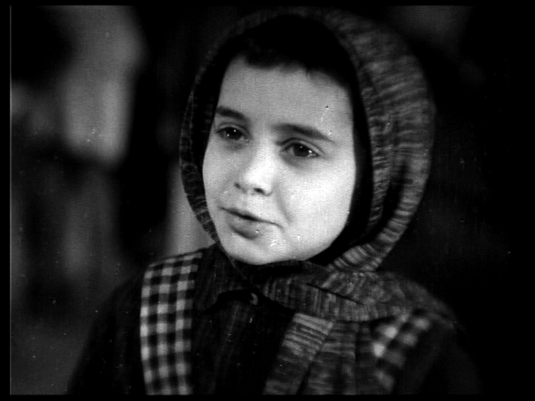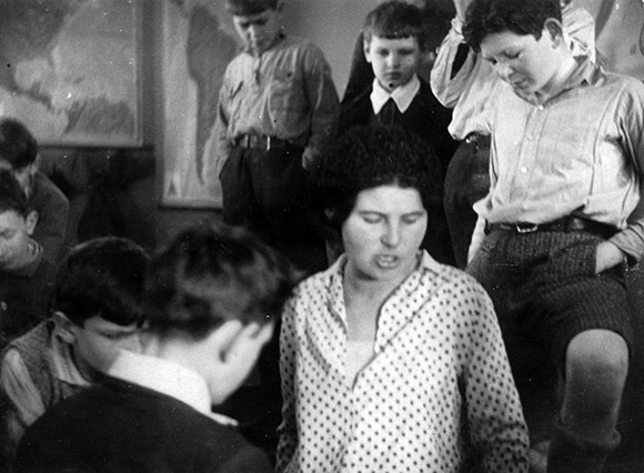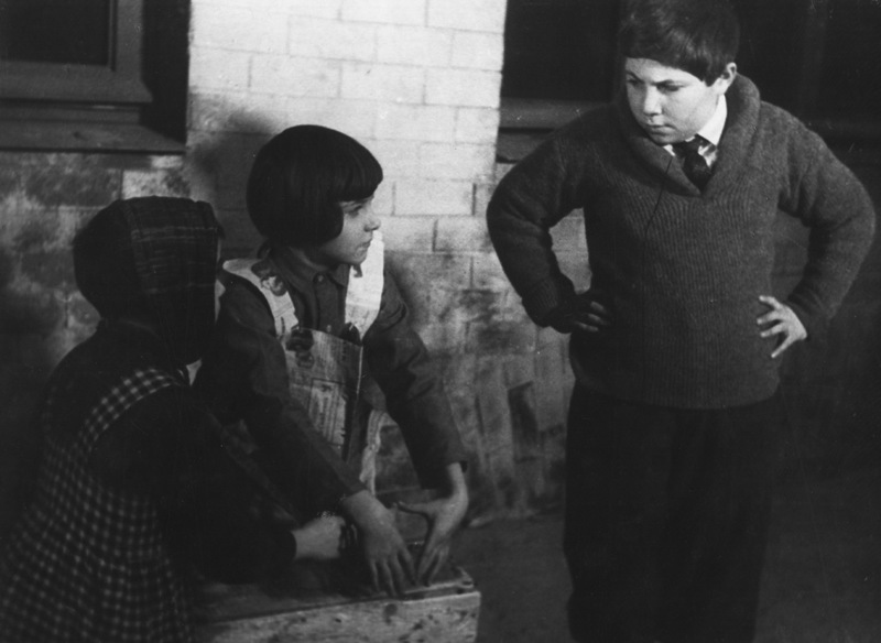Видя, что делать иначе не придется, я поставила себе тогда же задачу, работая по линии наибольшего сопротивления, не упускать делать общие выводы, необходимые вообще для этой работы. Так, например, один из героев картины, Буби, которого пришлось взять в последний момент, имел следующие данные: плохая память, плохое качество речи, общее физическое истощение, неустойчивое внимание. Вот на конкретных примерах работы с Буби можно проследить вообще применяемые способы работы с детьми в этой картине. Такая простейшая вещь, как осмысленный взгляд актера на крупном плане, оказался ребенку не под силу. Если просто предложить ребенку: «Посмотри туда-то», скажем, направо или налево, то ребенок искусственным движением повернет голову, у него неестественное напряжение мышц, у него пустые глаза. Кроме того, взгляд его не в состоянии зафиксироваться на одном месте, он моментально отвлекается, он смотрит по сторонам. Во время работы с ребенком я вырабатывала то, что называла для себя «устойчивостью взгляда». Делала я это в промежутках, даже тогда, когда ребенок не занимался. Скажем, простейший пример: показать ребенку два или три пальца, потом один, потом пять, спросить его, сколько это будет, за это время перевести ладонь повыше, пониже, направо, налево, дав ребенку заинтересованно сосчитать, сколько у вас пальцев. Если он действительно заинтересован в вашей руке, то взгляд его направлен и осмыслен. Направление взгляда вы меняете по необходимости. Дети не только привыкли сосредотачивать взгляд, но установилась чрезвычайно забавная связь между мной и ребенком, как бы второй конец был прикреплен ниткой к моим рукам. Впоследствии, стоило мне с совершенно спокойным движением поднять руку или сложить, или протянуть ее к ребенку, как он сразу непринужденно и свободно подчинял свой взгляд моему желанию, сохраняя ту эмоцию, в которую был ребенок введен по задачам данного куска.