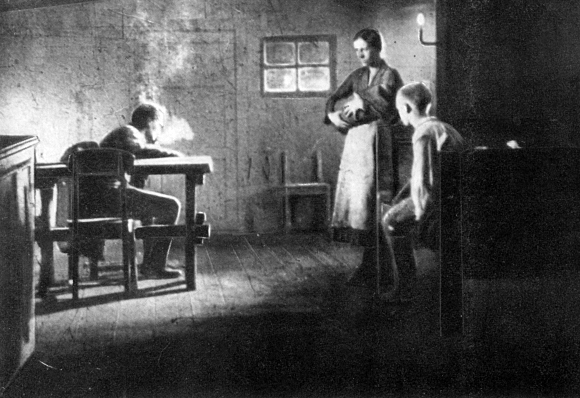 Если следовать нашей с Москвиным «портретной» терминологии, то «комната семьи Баэур» была групповым портретом. Низкое, почти чердачное помещение с тяжелой, нависшей черной балкой и скошенным потолком, в котором едва видно маленькое оконце. Слабо мерцает газовый рожок. Атмосфера нужды, бедности и непоколебимой воли к сопротивлению. Четкие, скупые портретные характеристики Крала Бауэра, его жены Марты, сына Фрица и других детей, а так же ворвавшегося детектива и полицейских. Всё это было достигнуто за счет очень тонкой комбинации световых пятен с помощью крайне ограниченного количества приборов (не более семи, а чаще всего пяти пятисоток и трехсоток), создававших нужное настроение, выделявших главное — лица Карла Бауэра и его семьи.