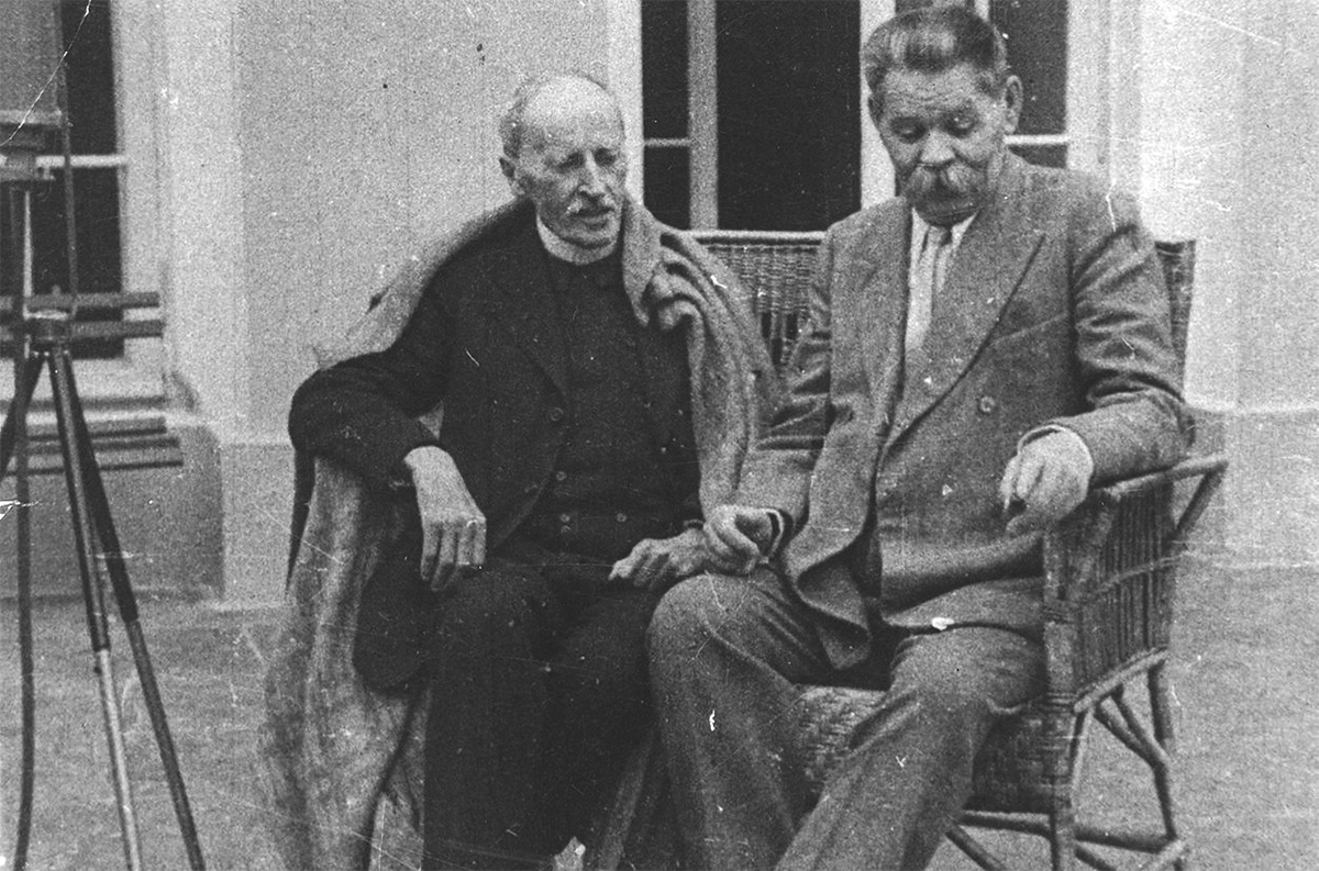 Тут же пригласили за чайный стол, и через минуты три вошел Роллан. Горький держится по отношению к нему необычайно внимательно, сам тушуясь, как бы не он был здесь хозяином. Роллан — высокий старик с красными как у кролика глазами и седыми бровями — производит очень больное и ветхое впечатление. Горький прямо бравый солдат рядом с ним. Роллан просит нас ему представить.