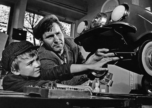Так и мечутся туда-сюда все шукшинские герои, кроме двух, у которых дуэты с маленькими мальчишками. Это его первая роль для прокатного кино — в «Двух Фёдорах» (1958) Хуциева, и еще «Мы, двое мужчин». Хуциевский самостоятельный дебют — вообще очень эксцентричная работа: там он разыгрывает мелодраму о налаживании послевоенного семейного быта, где место Мордюковой занимает девятилетний беспризорник, подобранный Шукшиным-солдатом по дороге с фронта. В «Мы, двое мужчин» разыграна карта попроще — злющему, вечно пьяному шоферюге баба подсовывает в кабину сынишку купить ему в городе школьную форму. Герои Шукшина сперва учат пацанов своим мужским навыкам — баранку крутить, плеваться, а потом смотрят вместе с ними и их глазами кино и спектакли; из волчьих глаз начинает брызгать то самое счастье, которое никак не ухватят за хвост все его прочие герои. Особенно хорошо это показано в «Мужчинах», где шоферюга и пацан сидят в кукольном театре на «Сказке о попе и работнике его Балде». Шукшин заходится в хохоте как мальчишка. Он ничего не помнит — только здесь и сейчас, и эти здесь и сейчас прекрасны.