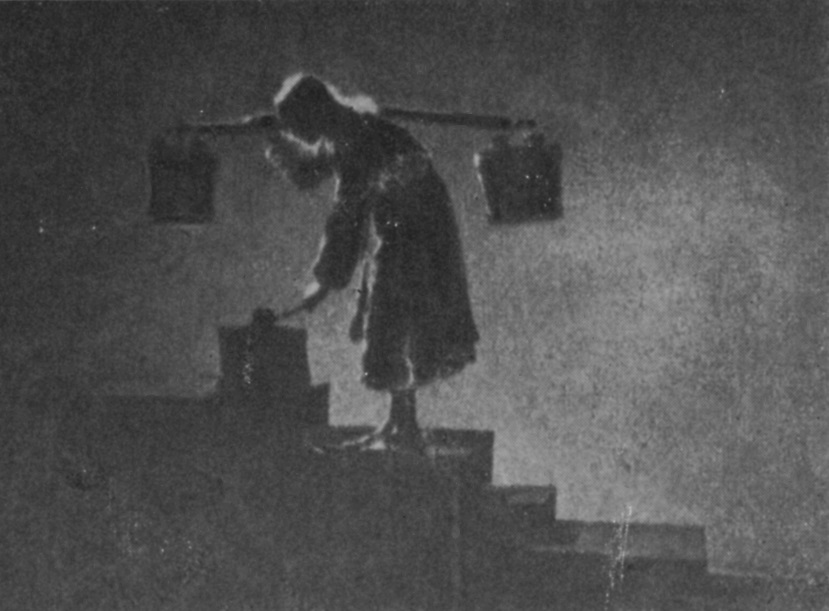 Застывшее живое изваяние Женщины с ребенком на руках (жена Пахаря). На ее щеке след от кнута, оставленный (в предыдущей сцене) панским Управителем. На той же щеке застыла крупная слеза. Женщина в молитвенном настроении стоит в церкви перед иконой богоматери, у которой тоже след кнута на щеке и слеза (такая икона есть, кажется, — Козельщанская).