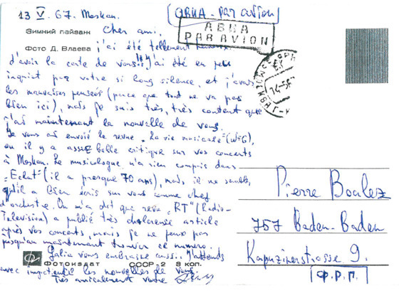 Эдисон Денисов — Пьеру Булезу (открытка)