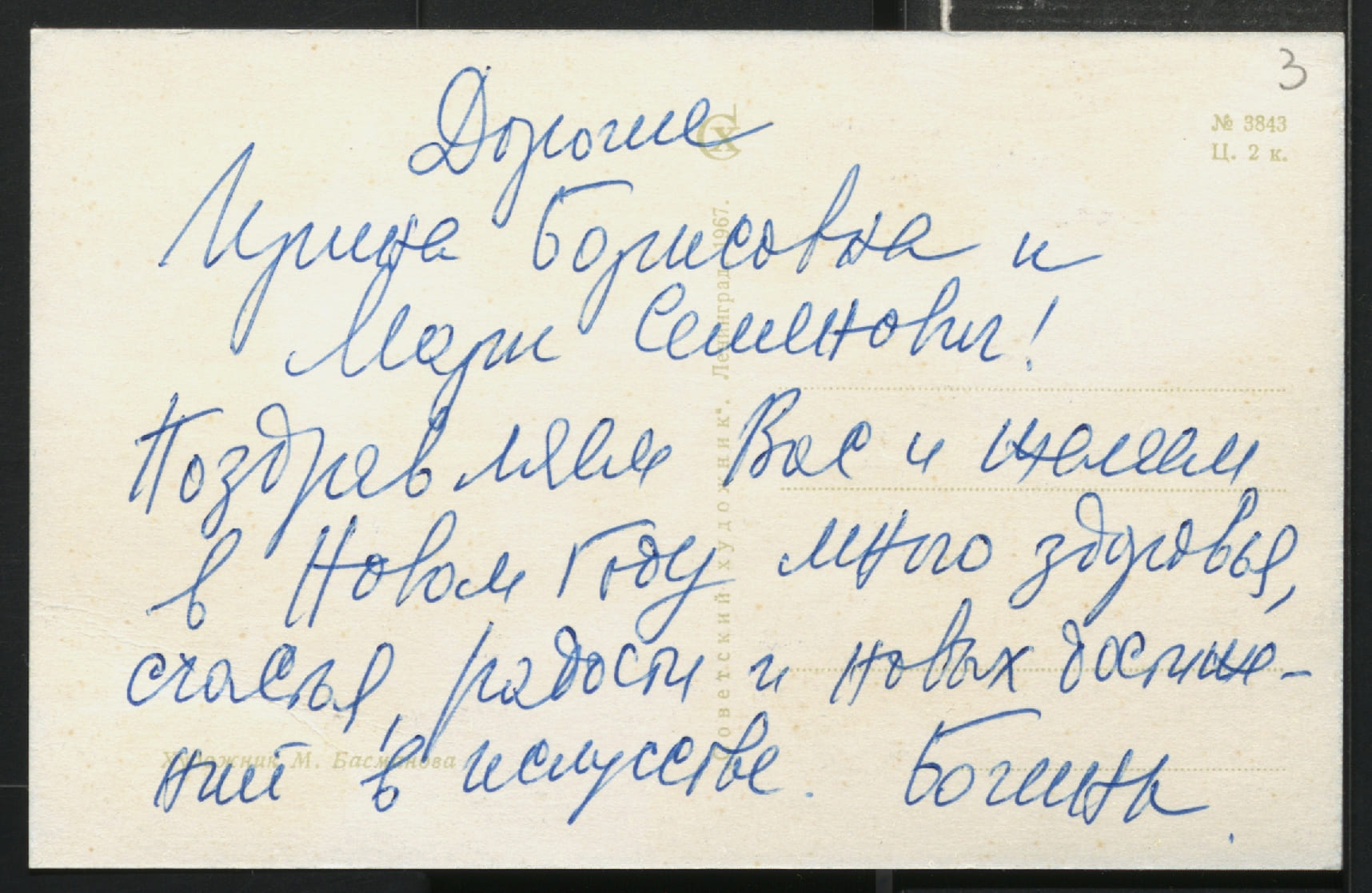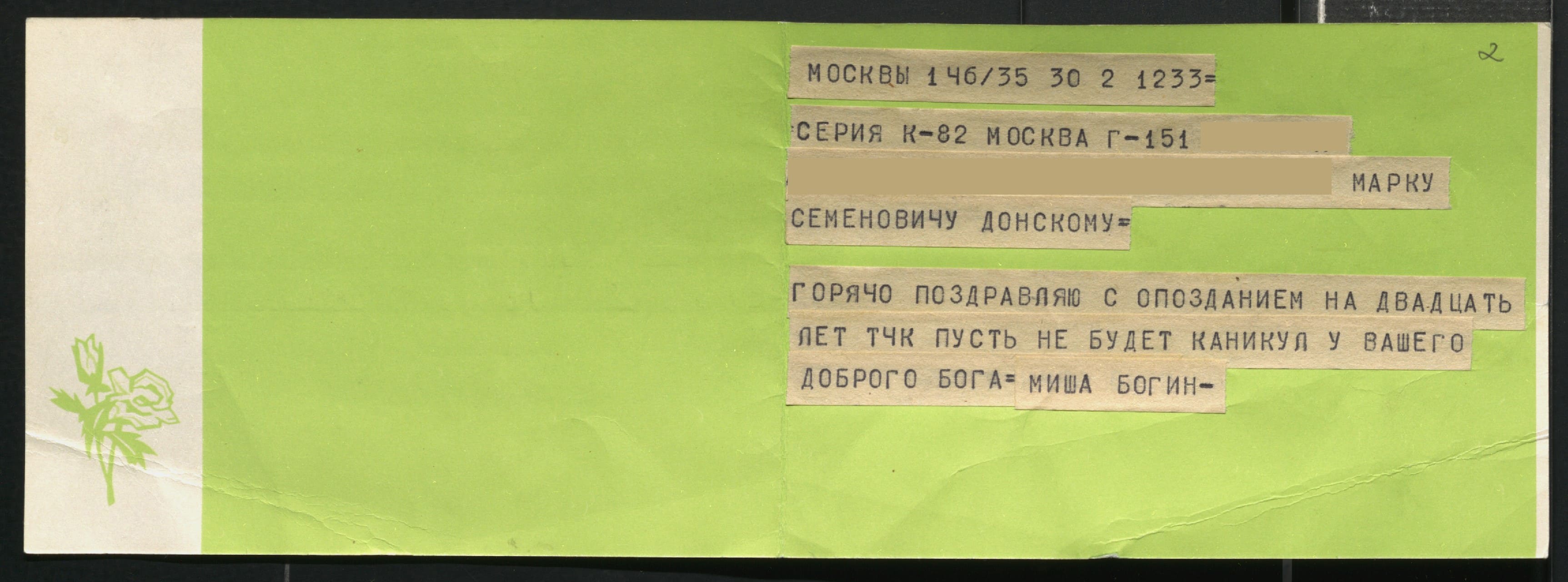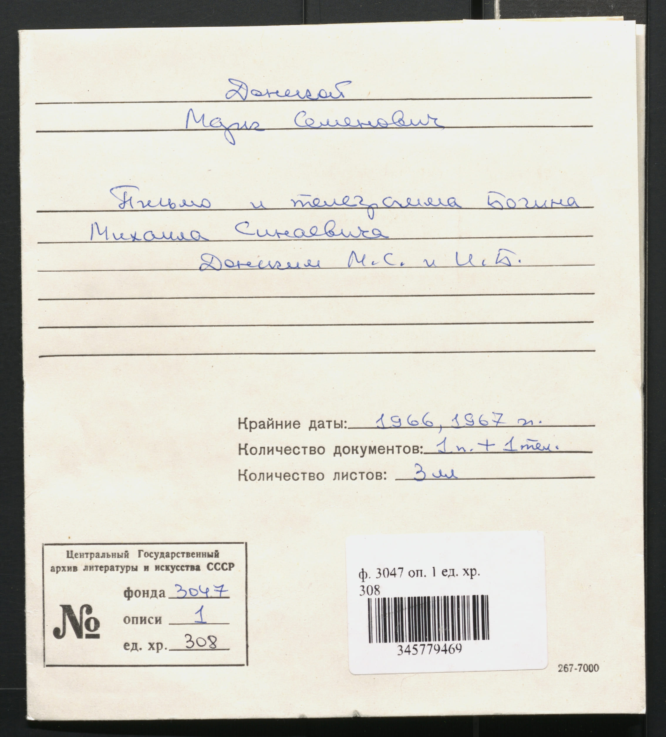 Российский государственный архив литературы и искусства (РГАЛИ). — Ф. 3047 (Донской Марк Семёнович), оп. 1, ед. хр. 308. Письмо и телеграмма Богина Михаила Синаевича Донским М. С. и И. Б. 1966, 1967. 1 п. + 1 тел. 3 л.