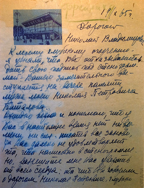 К моему глубокому огорчению — я узнала, что Вы отказываетесь дать свою подпись под стенограммой Вашего замечательного выступления на вечере памяти мужа моего Николая Петровича Баталова.
