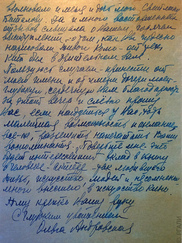 Пользуясь случаем — принести от моего имени и от имени дочери моей — глубокую, сердечную Вам благодарность за этот вечер и слёзно прошу Вас, если найдется у Вас, хоть малейшая возможность и желание, все-же, разрешить напечатать Ваши воспоминания. Поверьте мне — это будет интереснейший вклад в книгу о человеке — актере — так любившего жизнь, искусство, людей и, несомненно, много внесшего в искусство кино.