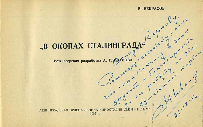 Печальный пример с фильмом «Звезда», его сложная кинематографическая судьба не погасили моего желания поставить картину о тружениках войны. Пока «Звезда» ждала своего часа выхода на экран, появилась не одна картина о войне, но не припомню среди них такой, которая соответствовала бы моим представлениям об этой теме. И я стал искать в литературе сочинение, которое было бы мне по сердцу. Вскоре я прочел повесть В. Некрасова «В окопах Сталинграда». Она мне понравилась. Простота описания больших и важных событий и в то же время глубокое проникновение в душу и сердце каждого героя, создание ярких, убедительных характеров рядовых участников великого сражения — все это влекло меня к материалу книги, и я снова и снова прикидывал: как из нее сделать картину. Но... кажущаяся простой задача, к моему удивлению, оказывала упорное сопротивление. После многих раздумий я пришел к неутешительному выводу: материал повести таков, что превратить его в киносценарий, ничего не меняя, нельзя. Этот материал для кино надо осмыслить совсем по-иному. Надо сохранить его свежесть и глубину, но показать события с какой-то другой стороны. С какой же другой? Этой, искомой стороны, я не видел. Так бывает нередко в сложном искусстве экранизации. И это соображение, видимо, связывало руки даже опытным драматургам. Ведь прошло несколько лет с момента опубликования повести, а никто из сценаристов за этот материал не взялся.