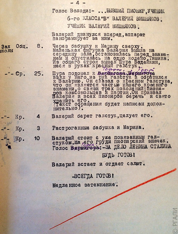Министерство кинематографии СССР. Сценарно-постановочный отдел. «Красный галстук». Заключение по литературному и режиссерскому сценариям и анализ работы по производству кинокартины // РГАЛИ. Ф. 2456. Оп. 1 ед. хр. 1690. Л. 6 — 10.