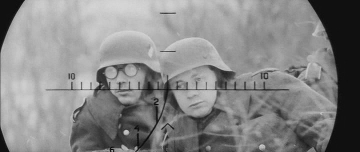 Прицел резко перешел и замер, подрагивая, перекрестьем на лбу офицера в очках. Офицер отворачивается от прицела, уютно спрятав нос в меховой воротник шинели. Подставляет прицелу спину.