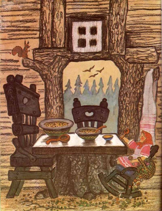 Когда мне представилась возможность побывать в мастерской покойного Васнецова, я увидела там, среди прочего, несколько кусков коры, лежащих на полу, и вспомнила, что в его иллюстрациях часто встречала подобные фактуры. Однажды на проходившей в Москве выставке детской иллюстрации из коллекции М. Раца перед оригиналом васнецовской иллюстрации к «Трем медведям» Юрий Норштейн признался мне, как он любит кору Васнецова. Не отсюда ли происходит то дерево в фильме «Ежик в тумане»?..