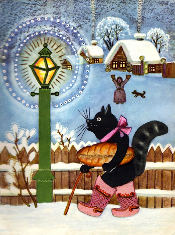 ...И еще о васнецовской традиции в творчестве Норштейна. В иллюстрациях Васнецова «фактурны» не только предметы, которые можно потрогать рукой, но и дым, поднимающийся из труб, и тяжелый цвет зимнего неба, и свежий воздух светлого морозного дня, и настроение, вызываемое ими (тоска, грусть, страх или радость). Каждое состояние очень зримо. Таким этот мир запечатлевается в детской памяти. В иллюстрациях Васнецова, так же как в фильмах Норштейна и Тарковского (в «Сказке сказок», в «Зеркале» и др.), многое ассоциируется с образом дома, с домашним очагом и связанными с этим переживаниями. Поднимающийся из трубы дым, окно, в котором горит свет или через которое видно ночное небо, сорока из детской присказки, которая варит кашу, или курица, подметающая веником пол в одном из детских стишков, стол, стул, кровать, печь — все это материализует знакомый нам образ дома, где свет, тепло, семья. Вместе с тем васнецовские иллюстрации к «Трем медведям» вызывают у читателей тревогу и тоску оттого, что на земле уже лежат длинные тени и скоро совсем стемнеет, за домом медведей виден страшный дремучий лес, а девочка находится далеко от своего дома. В иллюстрациях «Радуга—дуга» изображен кот, который в зимнюю ночь, держа под мышкой булку, идет по деревенской тропинке. Вокруг него темно и всё покрыто снегом. Но над тропинкой светит уличный фонарь, и в окнах домов на втором плане горит свет, а из трубы медленно поднимается дым... И, кажется, сам кот сейчас находится на пути домой, где его ждут близкие. Эти ассоциации с домом вызывают в душе читателей умиротворение и теплоту.