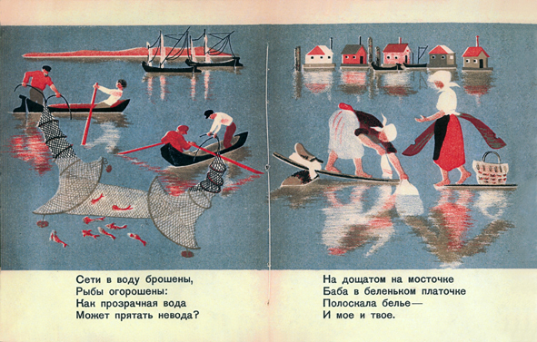 Для творчества Васнецова понятия «фактурность» и «материальность» являются важными, ключевыми. Деревянные тарелки и ложки, глиняный кувшин, липкая каша, круглый румяный хлеб... Все предметы в васнецовских иллюстрациях предельно материальны. Не случайно одна из лучших его работ — иллюстрации к толстовской сказке «Три медведя», где «всё вещественно»:[6] стол, чашки, ложки, стулья... Несомненно, это связано с детской способностью познавать мир «на ощупь». Ведь взаимоотношение ребенка с внешним миром начинается с того, что он прикасается к разным предметам. Он еще не пытается анализировать, но «чувствует» их фактуру. Иллюстрации Васнецова передают это удивление ребенка, который впервые увидел свет. Он пристально смотрит на все, что его окружает. Это своего рода «близорукое» восприятие, и, может быть, поэтому в иллюстрациях Васнецова отсутствует перспектива. Маленький ребенок не оценивает вещи по их назначению, он не располагает их по значимости; каждый предмет одинаково интересует его — просто как «неизвестный объект». При таком свежем, детском восприятии вещи перестают быть только вещами, какими их привыкли видеть взрослые. В этом детском восприятии есть что-то анимическое.