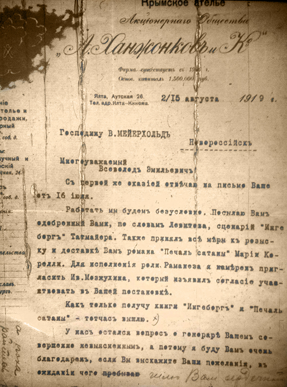 Работать мы будем безусловно. Посылаю Вам одобренный Вами, по словам Левитова, сценарий «Имгеборг» Тетмайера. Также принял все меры к розыску и доставке Вам романа «Печаль сатаны» Марии Корелли. Для исполнения роли Раманеза я намерен пригласить Ив. Мозжухина, который изъявил согласие участвовать в Вашей постановке.