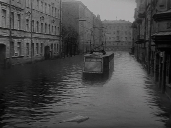 Водная стихия у Балабанова не менее активна, но ее роль не столь очевидна и меняется с течением времени. Вода присутствует уже в его ранних декадентских фильмах. Помните, как кончаются «Счастливые дни»? Короткий кадр, переходящий в рисунок: затопленная питерская улица, всегдашний балабановский пустой трамвай, словно полузатонувшее судно, а на рисунке та же улица и трамвай, а рядом лодка, и стрелка указывает: «Это — я». В лодке, по всей видимости, нашел последнее прибежище главный герой, потерянный человечек без роду и племени, даже настоящего имени его мы так и не узнали. Скорее всего, финальный образ искусственной реки посреди города, целиком на воде возведенного, — это проекция беккетовского и балабановского абсурда, которым наполнены «Счастливые дни». Но его можно трактовать и как версию всемирного потопа, который, как известно, послан человечеству за грехи.