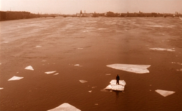 А вот фильм «Про уродов и людей» начинается и заканчивается кадрами реальной реки — Невы в пору ледохода. Побывавший в истории кинематографа символами и пролетарской революции, и хрущевской оттепели, ледоход несет здесь другую смысловую нагрузку. По реке прибывает в северную Венецию Иоган — некий инфернальный Гость, безродный космополит, посланник нездешних сил. Ему предстоит разбудить в местных обывателях пристрастие к пороку, а также внедрить весьма подходящее для этого новейшее техническое средство — синематограф. Осуществив свою миссию, заразив питерское население душком садомазохизма и порнографии, Иоган отбывает туда, откуда пришел, — но не на корабле, а перебежками по льдинам, оставаясь в итоге одиноким пятном посреди вырвавшейся из-подо льда реки.