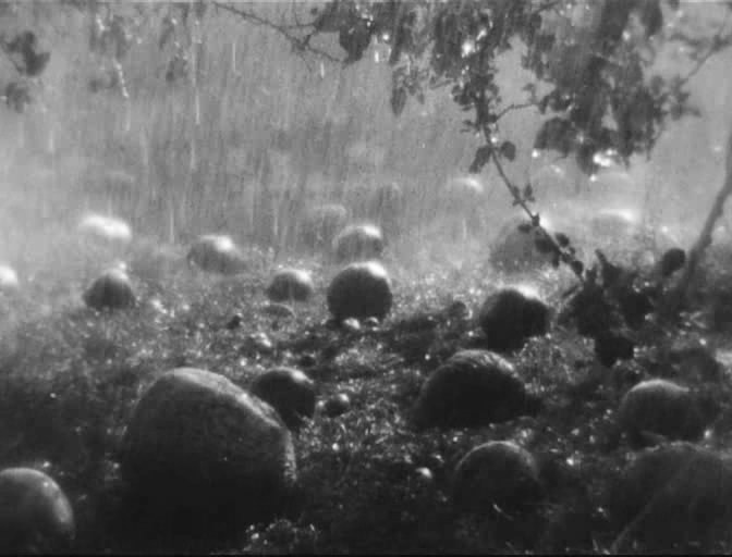 А кто это там примостился на призьбе под хатой и уже крутит ручку киноаппарата? Конечно, наш неусыпный оператор Даня Демуцкий, соратник и друг Довженко! Ничто не проходило мимо его аппарата, мимо его жадного внимания художника, который ни в ясную погоду, ни в дождь не теряет возможности хоть что-нибудь да отснять. Вот и сейчас, когда дождь стал утихать, Демуцкий, воспользовавшись этим, уже снимает дождевые капли в саду, которые скатываются с яблока на яблоко кристально чистые, как слезы. Затем он углядел огромную, животастуго тыкву, вылезшую из ботвы, — он и ее фиксирует на пленку. Где какой цветастый листик или необычный луч света промелькнет перед его глазами, Даня ничего не пропустит и отснимет. А потом, просматривая отснятый материал, мы всегда были приятно поражены сюрпризами даниных натюрмортов. И не удивительно, что «Земля» заканчивалась такими чудесными фотографиями дождя, земных плодов и кристальных дождевых капель — чарующим гимном природе. Гимном, пропетым не только режиссером, но и оператором Даниилом Порфириевичем Демуцким, небольшого роста человечком, с головой, как репка, с двумя пучками бровей, нависших над ясными глазами, интимными и пристальными. Тихий и скромный, малозаметный — он больше молчал и слушал. Это он, Даня, — гениальный исполнитель художественных замыслов Довженко в «Земле». Это он неповторимо отобразил на пленке и волнующееся море ржи, и знаменитых волов, и танец Василя, и смятенных коней. Помните мчащихся коней? Когда хоронят Василя, когда поп в церкви бессильно возводит руки к богу, не находя ответа, когда дивчина Наталка, протестуя против убийства любимого ее Василя, рвет на себе одежду и убийца Хома, как безумный, мечется по полям и огородам, — кони вихрем летят, встревоженные и неудержимые. Будто крик людской или стон, будто призрак стоголовый, гривастый, внезапно появившийся из-за горы и так же исчезнувший в долинах и ярах! А знаменитые подсолнухи и яблоки, которые как бы падают с экрана! А дождь, а... все, что он, оператор-чародей, отснял, все на экране будто дышит и поет, излучает аромат самобытной и дивной украинской природы.