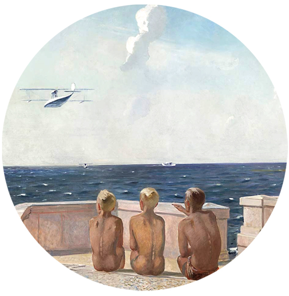 Пустоватые города, изображенные Георгом Гроссом на холстах 1920 года, словно сложены из ровных стандартных кубиков. Их населяют то ли манекены, то ли — инвалиды с протезами вместо культей. Тела этих обитателей словно состоят из обточенных цилиндриков, а вместо голов у них — столь же гладкие, округлые или яйцевидные, болвашки. Как и положено манекенам, они застыли здесь в самых нелепых искусственных позах. У Барской же — никаких манекенов. Выщербленные бетонные плиты сползают к морю, но на них сидят живые и трогательные малыши, вихрастый Буби в картузике и его подружка Эмма — ушастенькая, с тонкой шейкой и гладкой стрижкой «под мальчика», — и поют, горемыки, свои грустные песенки. Морские стихии забраны гранитом —но в их искрящихся волнах азартно плещутся радостные и, как им здесь и положено, совершенно голые мальчишки. Совсем уж изумляет, что Барская заставляет их во всей своей природной красе друг за дружкой взбегать по ступеням набережной — видно, с каким удовольствием снимались кадры с этими отнюдь не малыми детушками. Столь смелое изображение явно навеяно мифом о рождении из животворных водных стихий прекрасной и нагой Венеры — ясно, что в годы первых пятилеток авторы вряд ли широко оповещали об этом очевиднейшем источнике их «телесных» кадров. А при нужде — вероятно, пустились бы в идеологически верные, но крайне витиеватые рассуждения: если сама жизнь материалистически зародилась в морских стихиях, отчего бы и революционному бурлению не воплотиться в образе здоровых, прокаленных солнцем и просоленных морской пеной пролетарских детей, из этой же пены и под этим солнцем возникающих, — стихия рождает стихию! Над сумрачной Германией словно зазвенел бодрый советский девиз «Солнце, воздух и вода — наши лучшие друзья», и вместо унылых мотивов болезненной «новой вещественности» грянул мажорный Александр Дейнека с его культом здоровых спортивных тел, хотя его «Будущие летчики» (1937) к моменту съемок фильма еще не написаны.