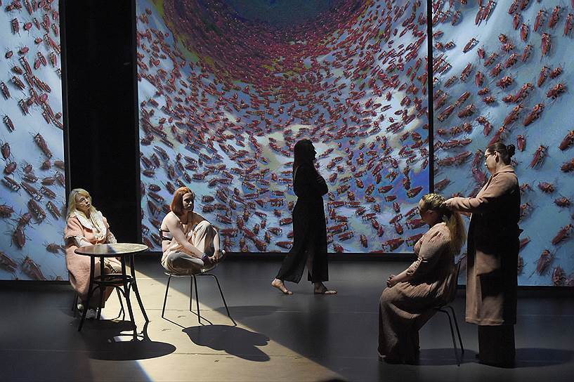 «Электротеатр Станиславский» заземлил этот страшный монолог. Именно тем, что в спектакле Зельдовича — не одна трагическая актриса, играющая борьбу с безумием на разрыв аорты, — а 19. Под нежный и очень классичный саундтрек (партитура Курляндского — развитые, видоизмененные, разбитые в стеклянную пыль осколки «Немецкого Реквиема» Брамса) — на высоких видеоэкранах идут видеоклипы группы AES+F: спуск в бледно-серый цилиндрический тоннель метро, в недра личности, в глубокую глотку безумия. Красно-золотые инсекты преследуют героиню, то обметывая скверной алой сыпью белый фон плоти, то вырастая в щеголеватых механических чудовищ, надевая рыцарский панцирь и вспухая ядерными грибами.