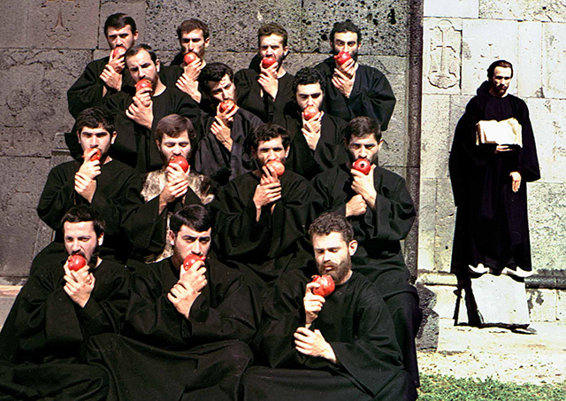 Чтобы быть справедливым, должен сказать, что так происходит не всегда. Так, относительно понятна сильная сцена, предшествующая смерти Саят-Новы. Он наблюдает за строящими храм каменщиками. Для усиления акустики, они замуровывают в кладку глиняные кувшины (так делали в старину). Каменщик предлагает Саят-Нове петь. Тот читает стихи, а каменщик как бы замуровывает звук этих стихов в глину кувшина. Стихи звучат и тогда, когда Саят-Нова умолкает. Тогда каменщик говорит - умри, Саят-Нова. В результате относительно небольшого напряжения этот эпизод фильма можно понять. Это аллегория, означающая бессмертие. Звук, замурованный в вечном камне, в вечной глине, будет жить вечно. Поэзия сохранится, когда носитель этой поэзии умрет.