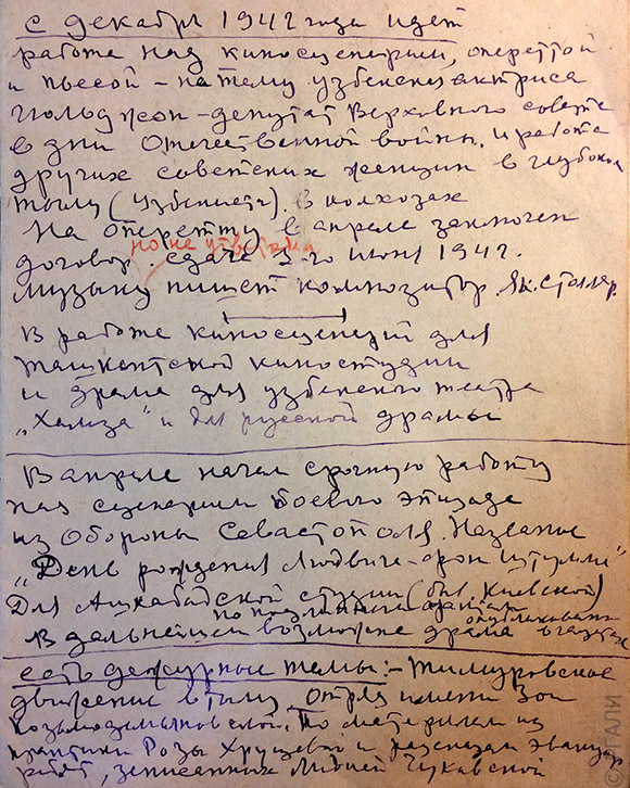 с декабря 1942 года идет работа над киносценарием, опереттой и пьесой – на тему узбекская актриса Гольджон – депутат Верховного совета в дни Отечественной войны. И работа других советских женщин в глубоком тылу (Узбекистан). в колхозах
