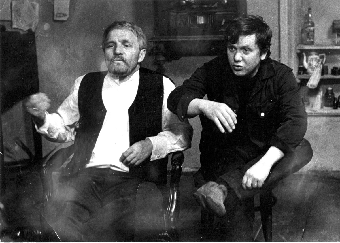 В гримерной Ульянов пробовал то одни усы, то другие, а я внутренне холодел. «Что, если какие-нибудь из них ему вдруг понравятся? Как мне тогда объяснить ему, что для этой картины нужно другое?» Воспользовавшись какой-то возникшей у гримеров паузой, я опасливо предложил: «Михаил Александрович, я тут приготовил один вариант булычовского грима. Может быть, попробуем?» — «Давайте», — охотно согласился Ульянов. Время тянулось нестерпимо долго. Пока на него надевали арестантский стриженный монтюр, потом усы, потом бороду, потом костюм, у меня обмирала душа — получалось именно то, что я хотел. Ульянов встал, посмотрел в зеркало, сказал: «Мне нравится».