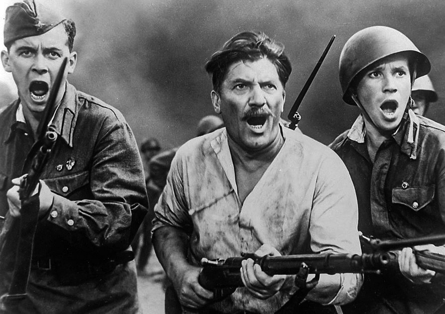 Таких выразительных, образных решений в фильме много. Вот боец около опрокинутого взрывом столба, на котором укреплен репродуктор, лихорадочно записывает речь Молотова о начале войны. Разрыв — бессильно валится обмякшее тело. Из репродуктора летят памятные слова: «Наше дело правое. Враг будет разбит...». И лежит упавший навзничь поперек столба боец — одна из первых жертв грандиозной битвы, суровое предвестие будущих неизбежных потерь.