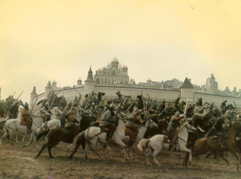 Очень долго режиссер надеялся, снять решающую битву русских с татарами 1380 года на Куликовом поле, но она стоила 200000 рублей. Тарковский разработал более дешевый, да и художественно более емкий вариант: утро после битвы. Еще в печатном варианте сценария эпизод служил прологом к фильму. ‹…› Как ни парадоксально, но как раз отсутствие эпизода Куликовской битвы, не вместившегося в смету, по тем временам внушительную, послужило одним из поводов запрещения фильма.