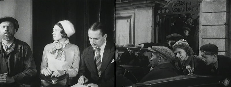 В фильме девочка одета, как дамочка, кокетливо и женственно. Вот на собрании за столом сидит молодая женщина, в белой шляпке на одну сторону — современно и модно. На шее небрежно повязан шарфик. А в классе ее активная подражательница: «фик-фок на один бок», в беретике и в шарфике. Чулочки натянуты — ни одной морщинки. Тут надо вспомнить, что платье и пальто можно было сшить-перешить, а чулок и обуви не было физически.
