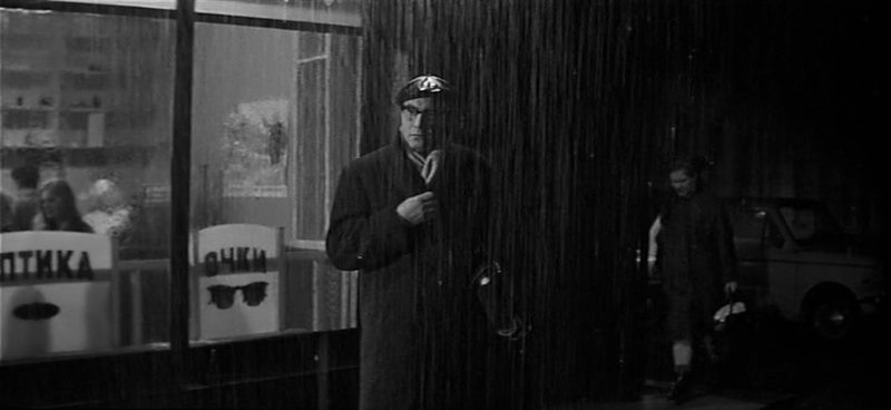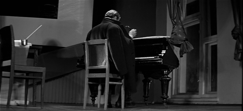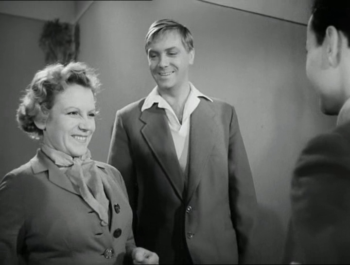 Историк. Фильм поделен на равные фрагменты напоминаниями о том, что Тихонов был на фронте. То песней, то военной фотографией, то «под Вязьмой», то словами ученика. А первый раз это решено костюмом. Когда Тихонов сидит за роялем, к нему подходит влюбленная учительница. Пальто накинуто на плечи, хотя играть не очень удобно в накинутом, но здесь это пальто — не пальто, а шинель. Оно отсылает нас к виденному когда-то, знакомому образу солдата на привале между боями. Вот он герой, как не влюбиться. И моложе намного выглядит в накинутом, чем эта учительница, его ровесница. А потом, в булочной, он все в этом же пальто, только застегнутом, уже не герой, а просто человек в очках и кепочке под дождем. Военного уже ничего нет.