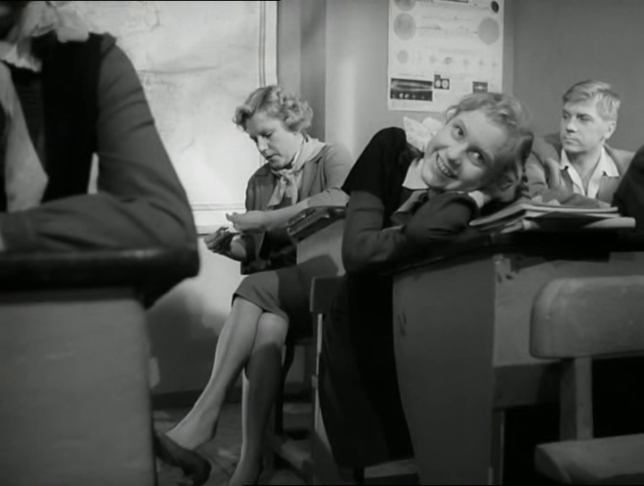 Ученица. Ольга Остроумова самая красивая девочка в классе. В начале, когда пишет сочинение, в школьной форме. С белым воротничком. Сама по себе советская школьная форма для девочек, повторяющая с изменениями форму дореволюционную, очень эротична (кстати, самая яркая и ударная коллекция модельера Ульяны Сергеенко сделана на основе школьной формы). Именно в этом эпизоде совокупность форменного воротничка, девичьего локона и юной шеи создают особое волнующее настроение и у зрителя, и у ученика-поэта. А в сцене их объяснения она уже не в форме, которая молодит, а в пиджачке и юбке, которые превращают ее в женщину, уже почти тетку, объясняющую мальчику, что ничего у них не выйдет.