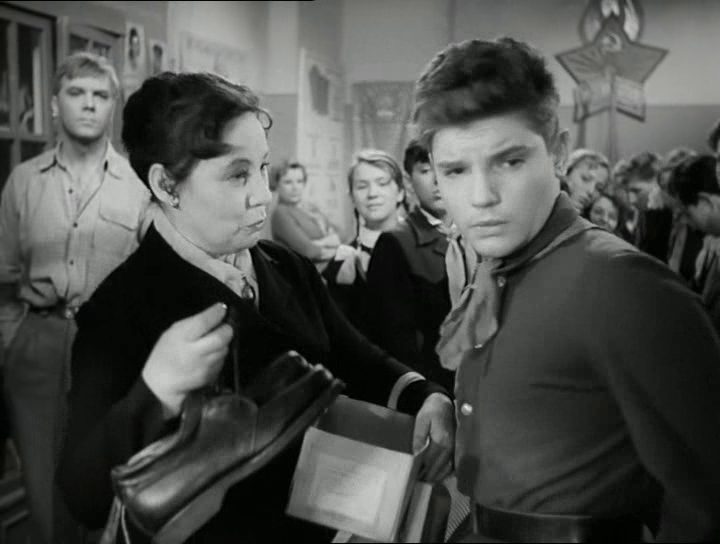 Оттепель. Она везде. И в школьной форме тоже. В классе все разные в классе, хоть и одинаковые. У Барской подход индивидуальный и индивидуальные вещи, а у Митты индивидуальный подход к одинаковым вещам. Кому рукава коротки, кому штаны, а кому все велико, на вырост, значит. У девочек форма воротника решает образ, и в этом фильме важную роль играет окружение шеи. У подруги Кольки воротник высокий и подпирает подбородок, у пионервожатой пионерский галстук, как завершение башенки: воротник блузки плюс воротник пиджака плюс галстук. Шея закрыта.
