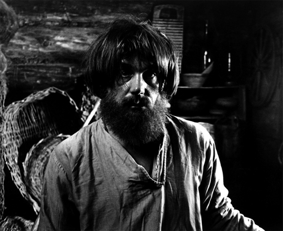 Только потом из затемнения — печальная русская изба и чувство чего-то плохого. Бородатый мужичонка с топором в одной руке и вязанкой баранок в другой. Выйдет на улицу, обнимет лошадку свою глуповатую, а потом уже в хлев к корове-кормилице, вешаться. Веревку перекинет, повиснет, глаза выпучит. Хрипит, а режиссер — его в белое. И титр — «Трофимъ». Титры на белом фоне — редкость. У Балабанова только раз еще — в «Счастливых днях», где в потусторонний мир изгоняет автор своего alter ego, человека-грибка, а тот, пошатавшись чутка, залезает, как в дом, в каменный гроб.
