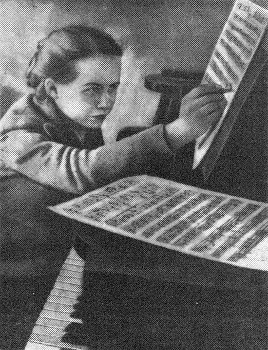На снимке: комсомолка Шура Пахмутова, ученица класса композиции лауреата Сталинской премии профессора Шебалина, работает над своим новым произведением.
