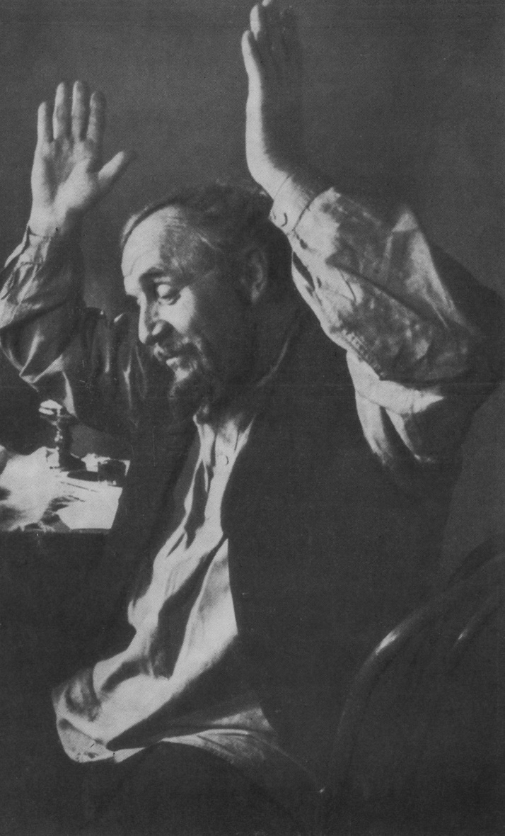 Не только иероглиф бородки, извозчицкая кепка-блин, дешевая оправа очков, тяжелые, непослушные пальцы, привыкшие больше к крестьянскому делу, чем к субтильной работе писания, но главным образом глаза, их взгляд из-под очков, в котором все понимание, и притерпевшесть, и неиссякаемое любопытство к жизни, человеческая доброта и блестки зоркой иронии — то, что называется душой народа, душа народа смотрит из его глаз. И мелодия речи — не акцент: до передразниванья акцента Ульянов, разумеется, не унижается — но мелодический рисунок, заложенный