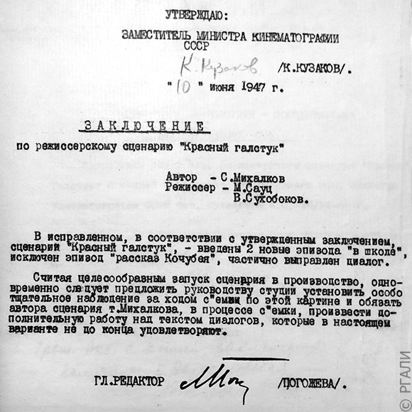 Министерство кинематографии СССР. Сценарно-постановочный отдел. «Красный галстук». Заключение по литературному и режиссерскому сценариям и анализ работы по производству кинокартины // РГАЛИ. Ф. 2456. Оп. 1 ед. хр. 1690. Л. 4.